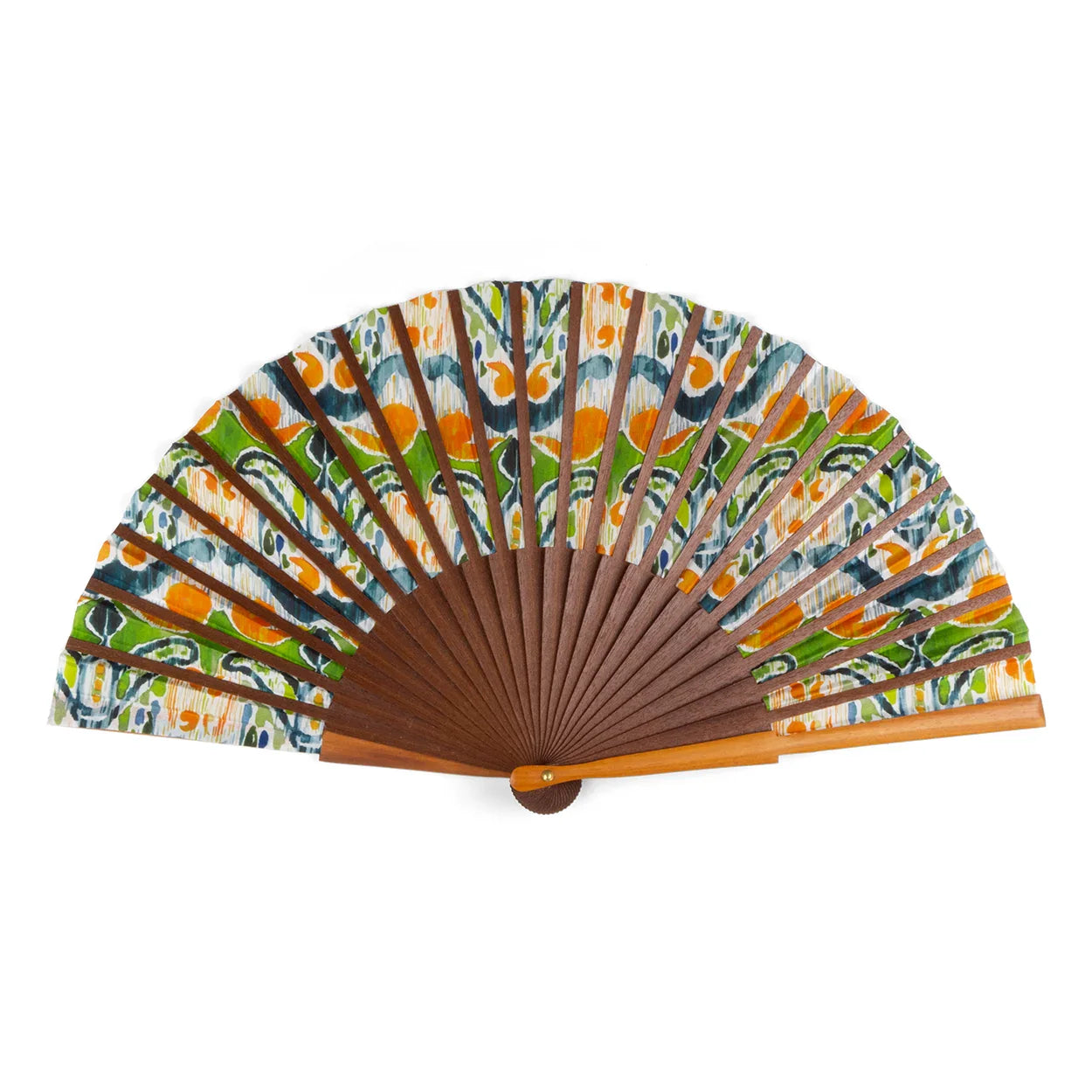 Abanico Seda y Madera Verde y Naranja Ikat