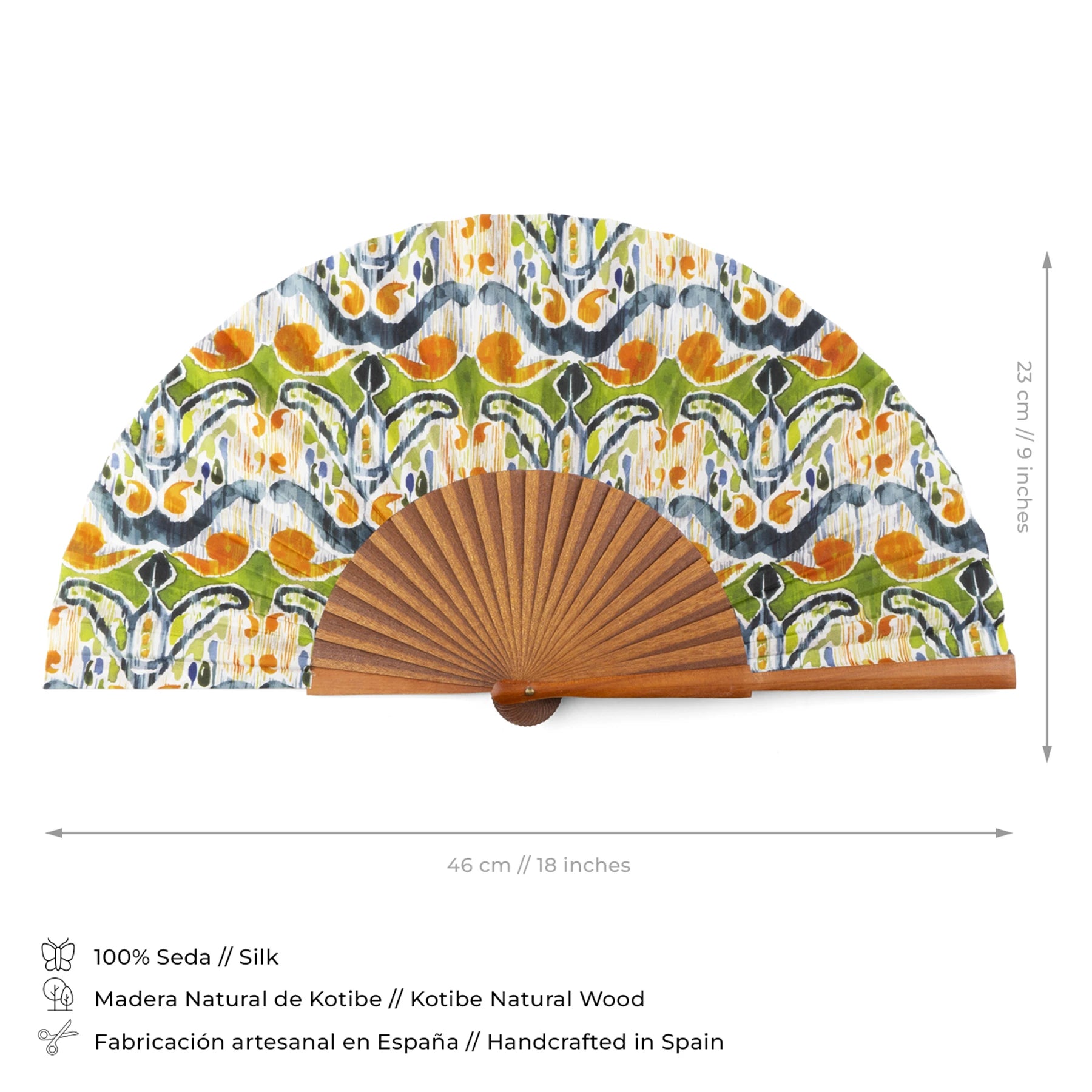 Elegante abanico de seda con un diseño inspirado en Ikat, hecho a mano con 100% seda y madera de Bocapi de primera calidad en Valencia, España. Este abanico artesanal combina la artesanía española con un diseño colorido, perfecto para agregar un toque de sofisticación a tus accesorios diarios.