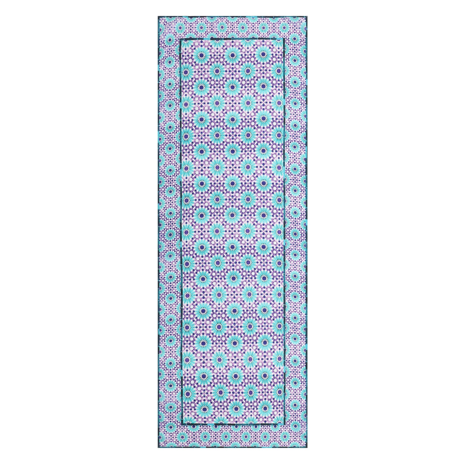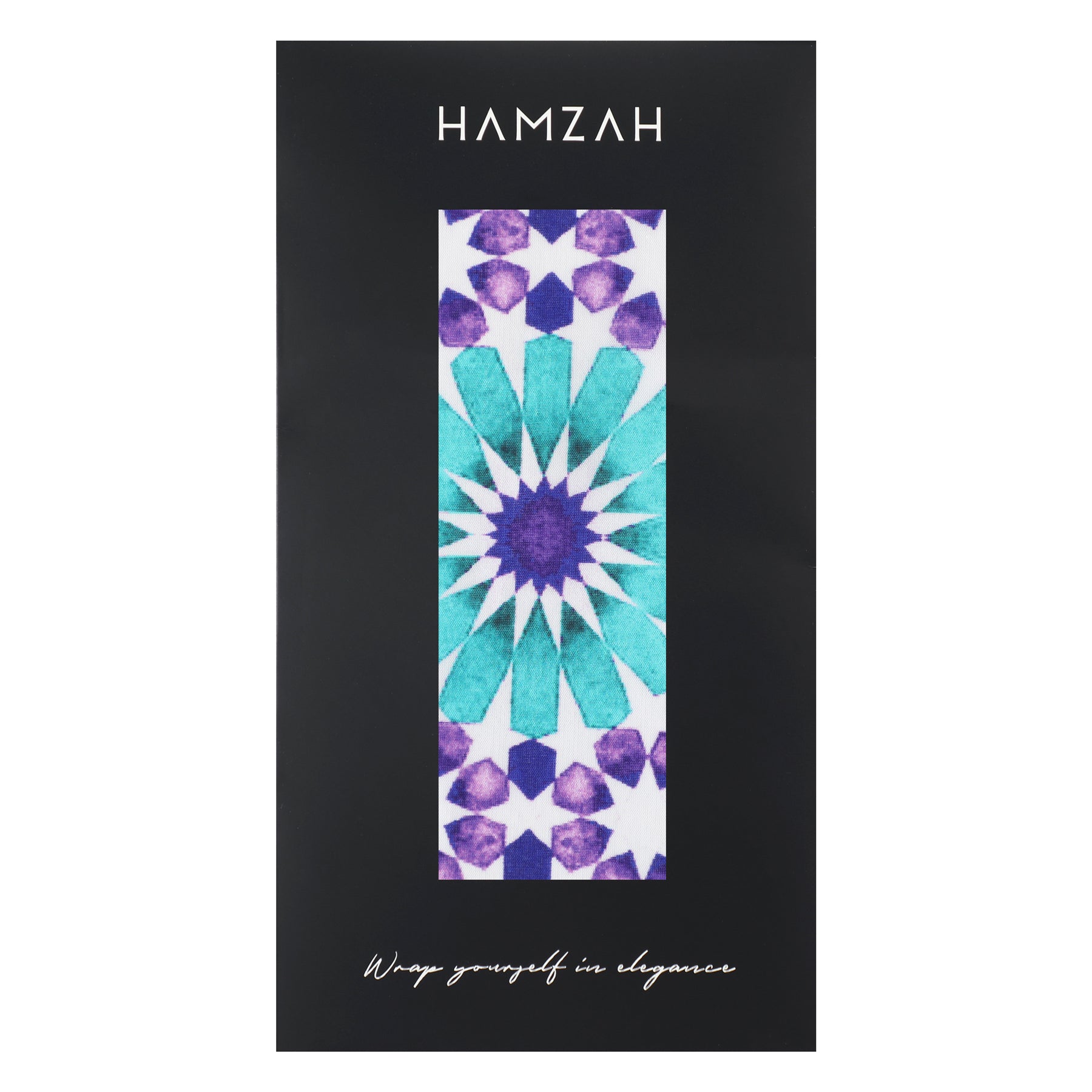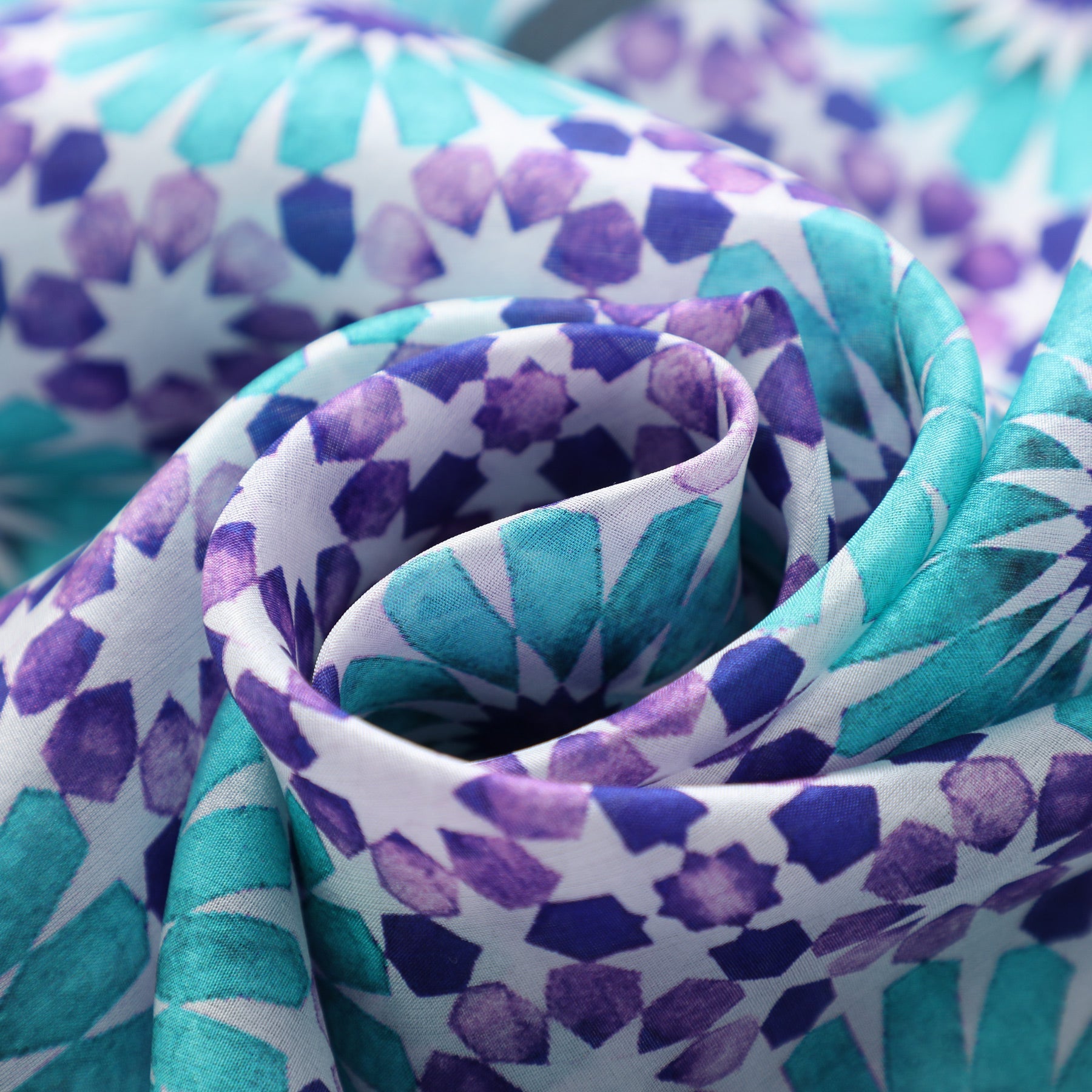 Experimente la belleza de la arquitectura islámica con nuestro exclusivo pañuelo de seda morado y turquesa, con un diseño geométrico inspirado en los mosaicos de mezquitas y palacios orientales.