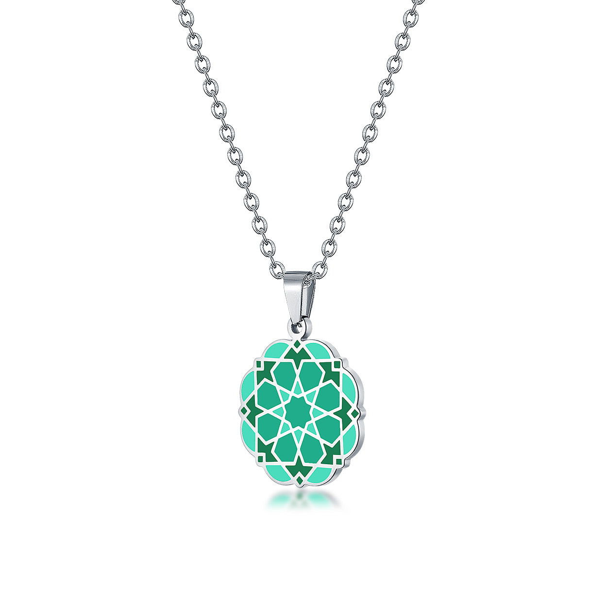 Elevate your style with our exquisite Moroccan Tiles Inspired Necklace Nazari Green. Crafted from stainless steel, this necklace brings a touch of elegance to any ensemble. The geometric design, rooted in Islamic Art, offers a unique and stylish statement. Perfect for upgrading your jewelry collection with a piece that stands out.