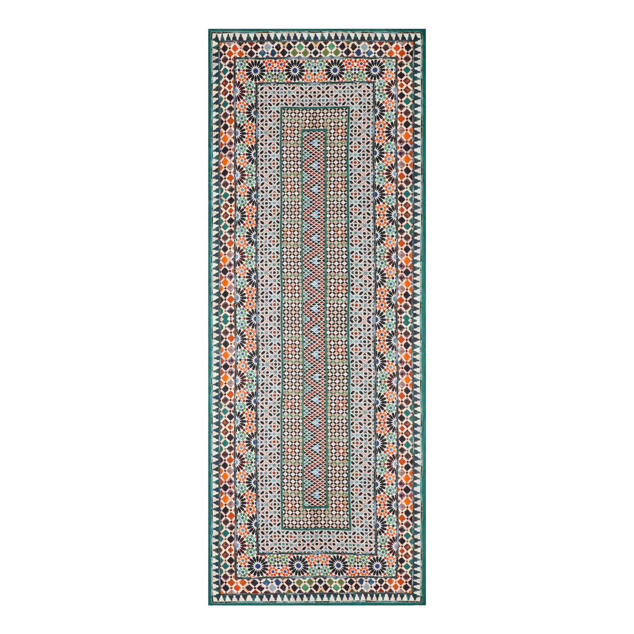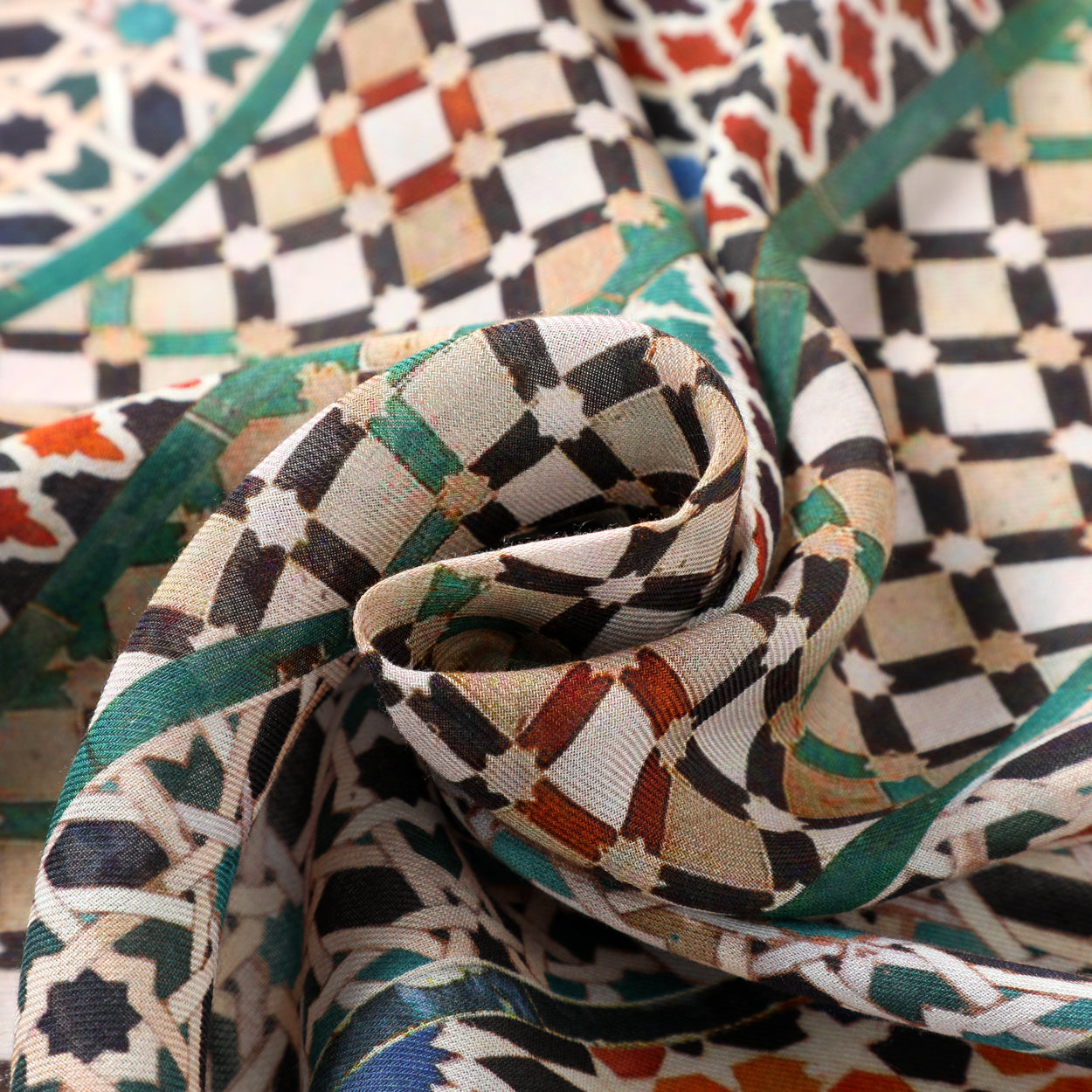 Featuring a unique composition of mosaic tile patterns, this scarf celebrates cultural heritage with vibrant shades of green, orange, black, and cream. Designed for both men and women, it is perfect for adding a splash of elegance to casual or formal attire.