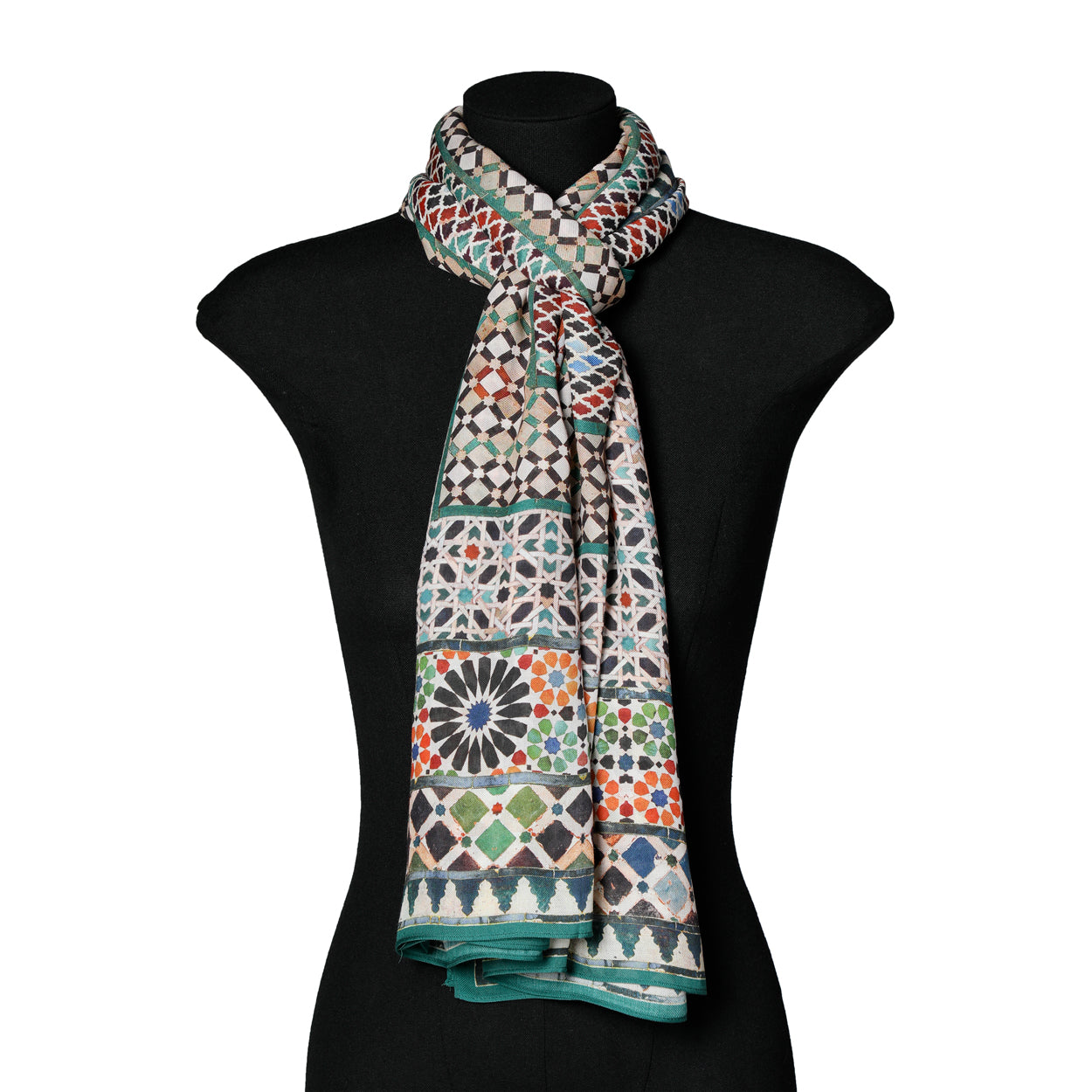 Immerse yourself in the rich tradition of Islamic art with this exquisite multicolor scarf.